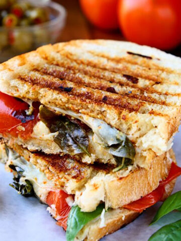 To make a panini in a grill pan, heat your pan on medium heat, lay your sandwich down in the pan, cover it with a fresh piece of aluminum foil and place a heavy skillet or dutch oven on top to weigh it down. Let cook for 3-4 minutes. Turn sandwich over and repeat. Easy peasy. A few words of caution: do make sure you wipe out the pan after grilling the tomatoes and before grilling the sandwich. If you don’t wipe out the pan, your sandwich may burn.