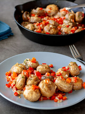 These marinated mushrooms are so easy to make, there really isn’t much to say about the preparation of this dish. You simply saute the mushrooms in your skillet for about 10 minutes, allow to cool for about 20 minutes and then stir in the garlic, bell pepper and shallot. This is where the mushrooms get most of their flavor. The magic then happens in your fridge. Hopefully you can resist sampling a mushroom or two, but I won’t tell anyone if you can’t. If you are planning on taking these to a party, I would recommend making two batches, so that you have plenty for sampling purposes. You need to try them before you serve them, right? 😉