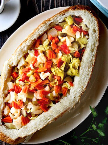 And don’t think that because it has all of those vegetables that it will be bland. Trust me, it’s loaded with a lot of fabulous flavors! Flavors like pesto, sun-dried tomatoes, kalamata olives, fresh parsley and provolone cheese, not to mention the kick of the peppers that are in the giardiniera. As if all that wasn’t enough, we then to put all of this goodness inside a crusty bread loaf. Heavenly!